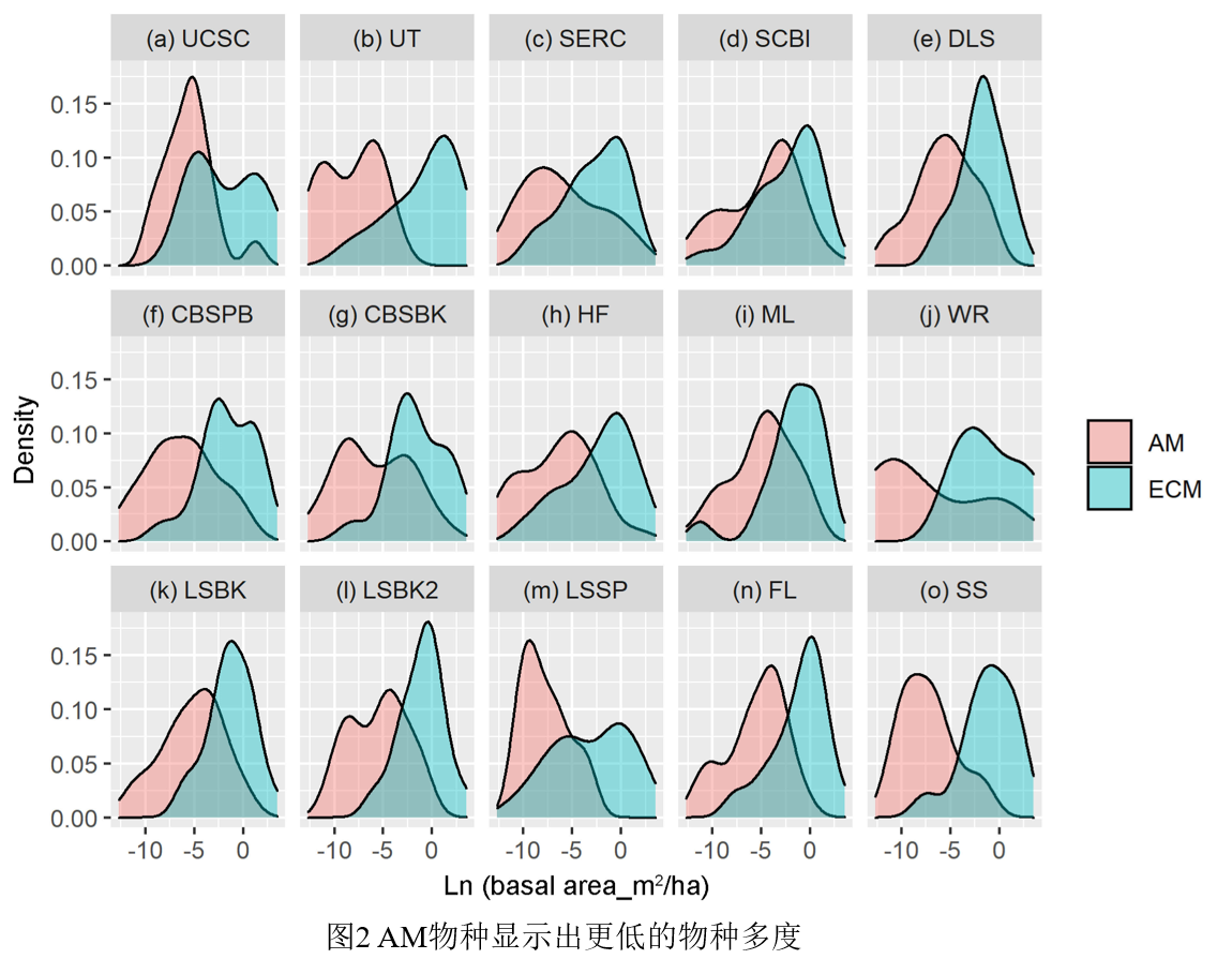 由于温带森林多为ECM植物,而热带森林多为AM植物,该研究指出植物菌根类型转换引起的生物相互作用强度变化可能驱动纬度梯度的植物多样性格局,为解释纬度梯度多样性格局提供了一个新的视角。此外,本研究还得到了国家自然科学基金资助。