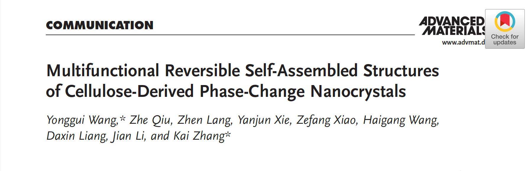 近日,我校李坚院士、谢延军教授团队的青年教师王永贵教授在纤维素纳米单元的智能组装领域取得创新成果,以东北林业大学为第一单位在国际著名学术期刊Advanced Materials(IF2019:27.398)上以“Multifunctional Reversible Self-assembled Structures of Cellulose-derived Phase Change Nanocrystals”为题发表相关研究论文。论文第一作者为王永贵教授,通讯作者为王永贵教授和德国哥廷根大学张凯教授,李坚院士和谢延军教授对该工作做出了指导和建议。该工作受到国家自然科学基金等项目的支持。