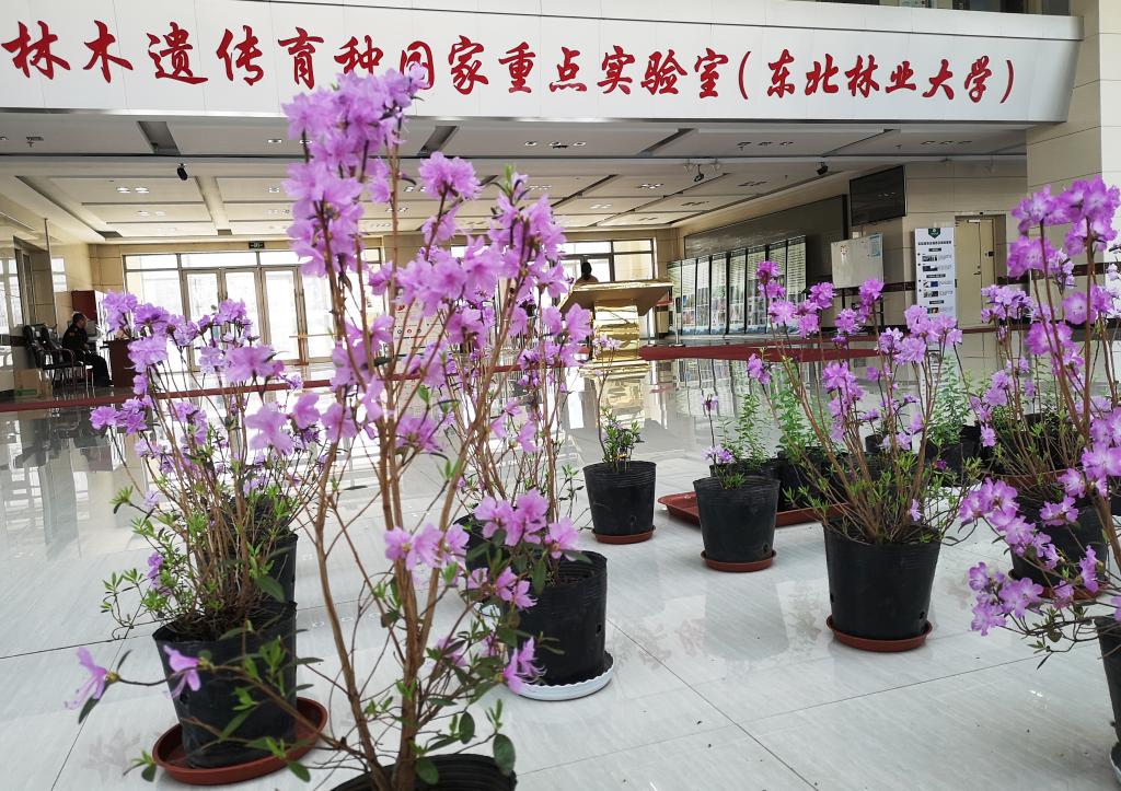 林木遗传育种国重室大厅里盛开的兴安杜鹃花
