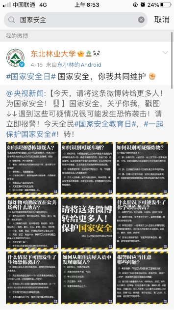 学校官方微信刊发了《别闹!国家安全还有这些你不知道……》的文章,号召广大师生居安思危,以个体之力形成合力,维护国家安全。