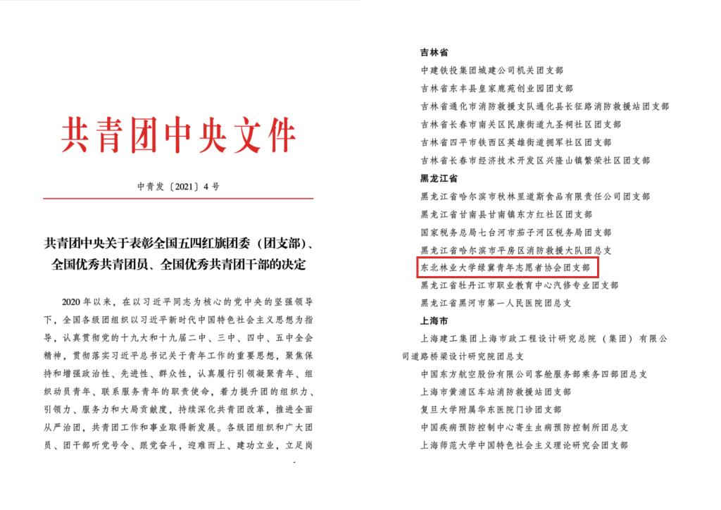 日前,共青团中央公布了“全国优秀共青团员”“全国优秀共青团干部”“全国五四红旗团委(团支部)”名单,我校绿冀青年志愿者协会团支部喜获“全国五四红旗团支部”荣誉称号,是黑龙江省唯一获奖高校团支部。这是共青团中央授予基层团支部的最高荣誉,也是我校学生社团团支部首次获此殊荣!