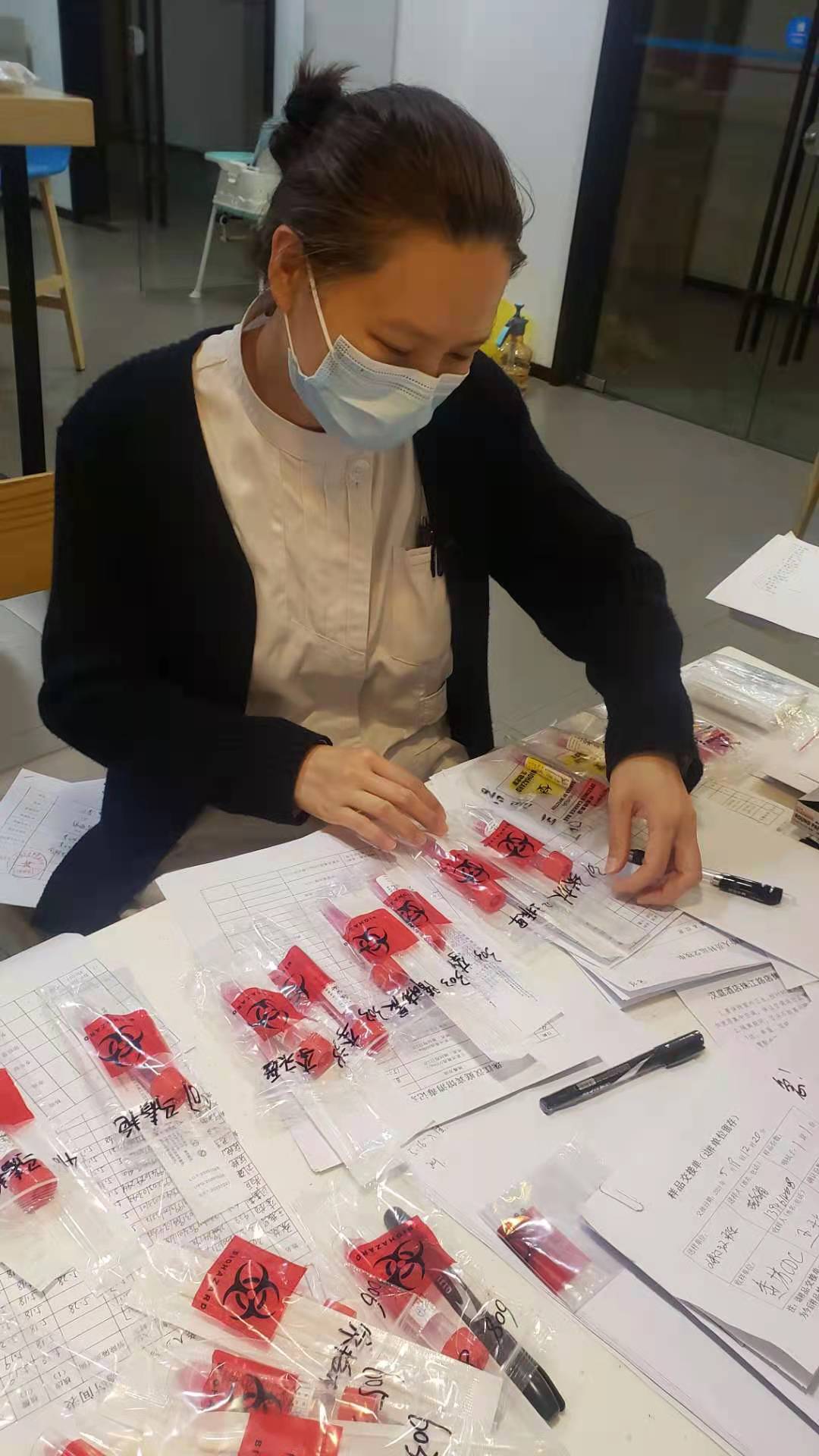 隔离宾馆的留观人员都是新冠肺炎确诊病例的密切接触者或有疫区旅居史的返哈人员,虽然医务人员个人防护到位,但他们的工作依然存在一定的风险。我们的医务人员每天穿着厚厚的隔离衣一进隔离区就要连续工作四五个小时,他们要为留观人员采集核酸、问询不适症状、测温、区域消杀、收纳医疗垃圾、数据整理上报,他们不敢多喝一口水、多吃一口饭,常常是饿着肚子坚持工作。N95口罩在他们脸上勒出深深的印痕,长时间戴着乳胶手套导致手部出现过敏性湿疹,每次在隔离区完成工作出来时,每个人都是汗流浃背,贴身的衣服全都湿透。留观人员入住隔离宾馆的时间不固定,常常是半夜转送进来,我们的医务人员就日夜连续工作,常常需要奋战到天亮也没法休息。