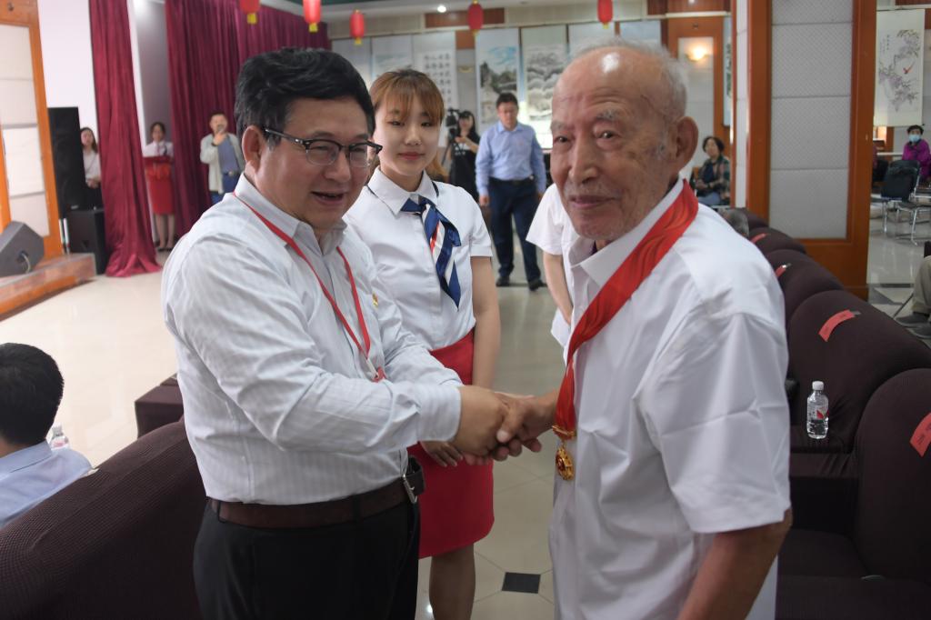 五十载风雨兼程,五十年砥砺奋进,光荣在党的五十年,是离退休老同志们初心不改、使命在肩的五十年,是勤勤恳恳、默默耕耘的五十年,是不畏艰难、奋勇争先的五十年,五十载的光阴在老同志们的脸上留下了岁月的印痕,却始终无法老去他们的赤诚之心!不忘初心、牢记使命的共产党人永远年轻!党委书记张志坤,党委副书记、纪委书记王玉琦,党委常委、副校长刘守新、雒文虎、宋文龙、翟雪峰依次为98名老党员佩戴“光荣在党50年”纪念章。学生党员向“光荣在党50年”的老党员献花。