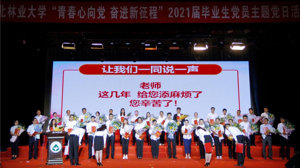全体毕业生辅导员依次走上台与同学们告别,毕业生党员代表们上台向陪伴自己走过青春岁月、指引自己走向政治成熟的辅导员老师们献上鲜花和亲笔写就的感恩卡。在感动又激昂的朗诵声中,在领诵毕业生代表的倡议下,全场高声说出:老师,这几年给您添麻烦了,您辛苦了!真挚朴素的话语表达了同学们临别之际的浓浓眷恋之意,以及饮水思源的深深感激之情,多名辅导员老师泪洒当场。