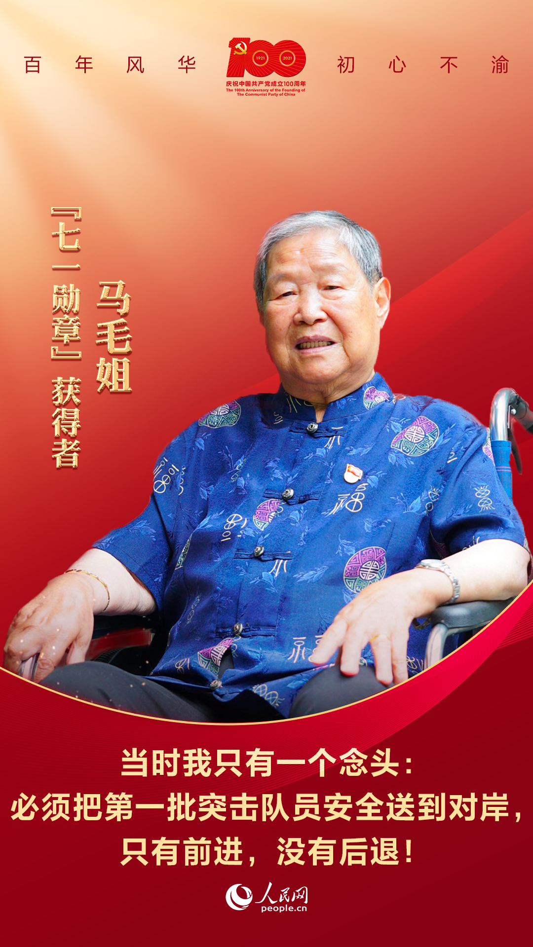 “据马毛姐后来回忆:一个挎盒子枪的解放军见我是个小姑娘,说:‘这怎么行,很危险,你不怕吗?’我说:‘我不怕死。我会掌舵。我会划水。’我哥哥的眼睛不好,在船桅杆边扯帆,我一手掌舵,一手划桨,就这样,船只快速地向南岸破浪前进。子弹从身边呼啸而过,随时都有中弹的可能。这时的我只有一个念头:必须把第一批突击队员安全送到对岸,只有前进,没有后退!”