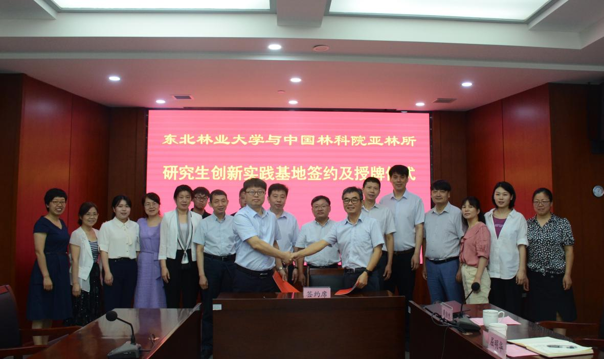 为深入贯彻落实习近平总书记对研究生教育工作的重要指示精神及全国研究生教育会议精神,推进研究生分类培养,提高研究生创新能力与实践能力,加快培养经济社会发展及林业产业发展急需的高层次应用型人才,7月8日,我校与中国林科院亚林所在杭州市富阳区举行研究生创新实践基地签约及授牌仪式。中国林科院研究生部主任林群,亚林所党委书记汪阳东,我校副校长刘守新,研究生院常务副院长陈广胜,林学院院长孙龙等相关负责同志出席了签约仪式,签约仪式由亚林所副所长盛能荣主持。