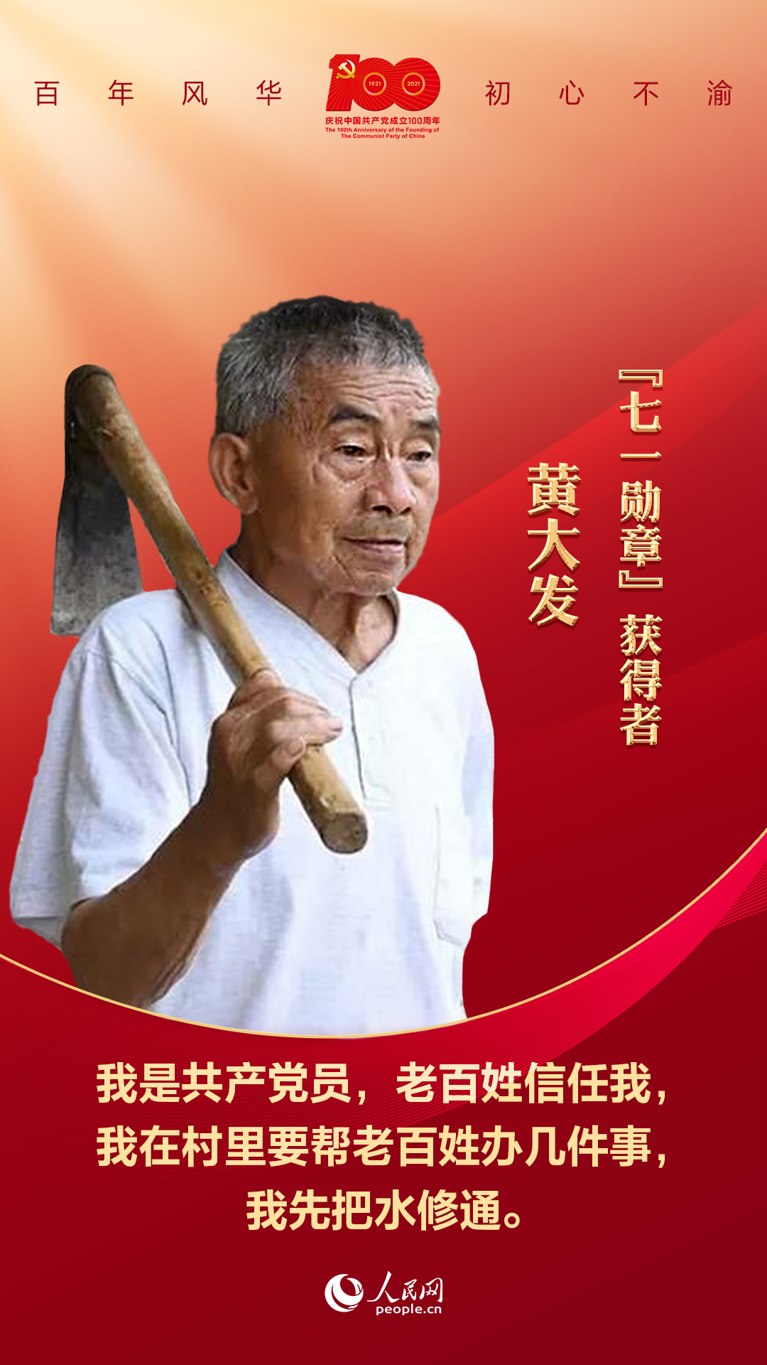 6月29日,黄大发获授“七一勋章”。他在人民大会堂前的台阶上,佩戴着“七一勋章”拍照留念,一双远比常人粗大的手颇为扎眼。谁能想到,就是靠这一双手,在36年的漫长时光里,黄大发带领村民们在灵宝山上生生凿出一道长达9400米的水渠——“大发渠”,将水源引入了被重山环绕的村庄。