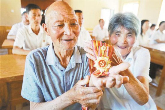 载誉归来的魏德友向大家展示“七一勋章”,分享喜悦(摄于7月3日)。管述军 摄