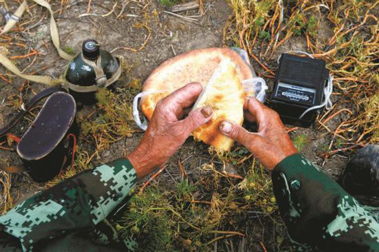 魏德友放牧巡边时,都会带着干粮和他的“三件宝”:锈蚀的军用水壶、老式收放机、62式军用望远镜(资料图片)。王德江 摄