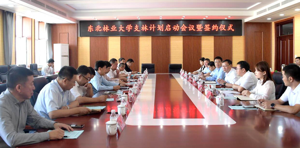 8月30日上午,东北林业大学支林计划启动会议暨签约仪式在综合楼10楼会议室举行。东北林业大学校长李斌,黑龙江省林业和草原局党组成员、副局长时永录,大兴安岭地区行政公署地委委员、地委组织部部长姜海涛,大兴安岭地区行政公署行署副专员孙亮,中国龙江森林工业集团有限公司党委委员、党委组织部部长赵宏宇,大兴安岭林业集团公司副总经理刘志等出席会议。东北林业大学党委常委、副校长宋文龙主持会议。
