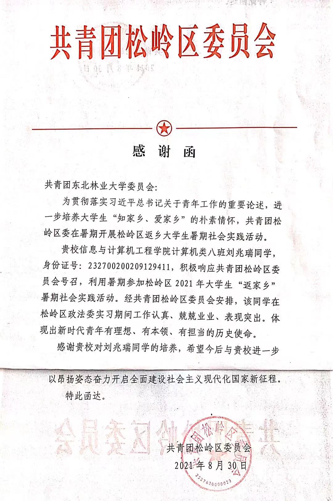 疫情爆发后,刘兆瑞同学立刻写下“抗疫请战书”,投身于家乡疫情防控工作,负责全区三万人口的疫情信息统计工作。刘兆瑞日均服务13小时,累计整理数据万余条,拨打电话千余次,逐个排查中高风险地区漫入本地人员300余人,打印汇总造册。刘兆瑞同学表示,此次志愿服务,让我对党员精神和基层工作有了更深的认识,社区工作者和党员志愿者戴上小小的红袖标,就代表着冲在抗击疫情的第一线,是责任与热忱让他们始终坚守,国家面对重大考验时,我们青年学生应该挺身而出。松岭区委在感谢函中高度赞扬刘兆瑞同学在志愿服务期间的突出表现以及工作认真严谨的态度,对我校对刘兆瑞同学的培养表达了真挚的感谢。