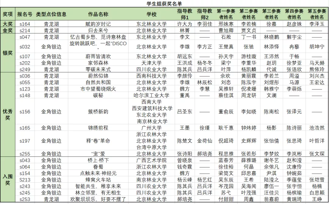 大赛自2021年7月19日开展以来,受到了全国各地高校与相关专业人士的广泛关注。报名阶段官方共收集到来自全国各地334组参赛者的报名参与。其中,学生组259组,专业组75组。此次大赛经过多轮投票评选,专家组最终确定学生组大奖1名、金奖1名、银奖5名、优秀奖8名以及入围奖7名。其中,我校园林学院学生团队在众多优秀学子中脱颖而出,共获得大奖1项、银奖2项。