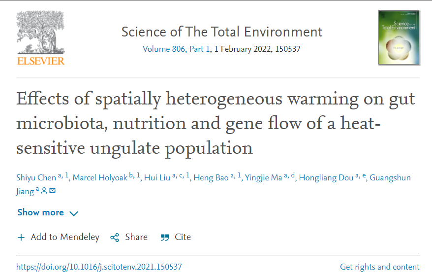 日前,我校姜广顺教授团队在通过景观遗传学、营养生态学和宏基因组学等整合生物学手段证实了气候变暖驱动了驼鹿种群分布区逐渐向高纬度和高海拔区域退缩和其如何适应的关键证据链,已于9月26日在国际知名期刊《Science of the total environment 》(2021 IF=7.963; 5-year IF=7.842, Top期刊)上在线发表了题为“Effects of Spatially Heterogeneous Warming on Gut Microbiota, Nutrition and Gene Flow of a Heat-sensitive Ungulate Population”的研究论文。