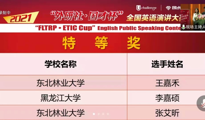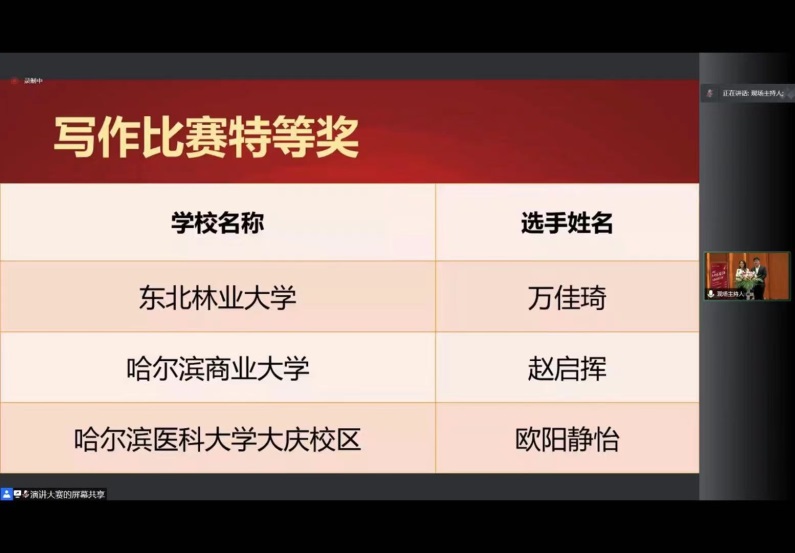 11月18日,2021年“外研社·国才杯”全国英语演讲大赛黑龙江省决赛在线上成功举办。我校选手王嘉禾、张艾昕以黑龙江省第一名和第三名的好成绩获得大赛特等奖。大赛同时公布了之前的阅读和写作大赛成绩,我校选手万佳琦以黑龙江省第一名的成绩获得写作大赛特等奖。三人将代表黑龙江省分别参加全国英语演讲和写作大赛总决赛。我校其他选手杨薪颖、刘璐、刘书琪分别获得写作、阅读大赛全省一等奖;蒋杭言、马珺婕、范宇航分别获得写作、阅读大赛全省二等奖;王乐铭获得写作大赛全省三等奖。