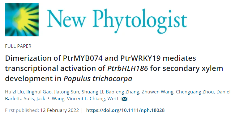 近日,林木遗传育种国家重点实验室(东北林业大学)李伟研究组在New Phytologist(TOP期刊,IF=10.151)上在线发表了题为“Dimerization of PtrMYB074 and PtrWRKY19 Mediates Transcriptional Activation of PtrbHLH186 for Secondary Xylem Development in Populus trichocarpa”的研究论文。该研究发现了调控杨树次生木质部发育的“PtrMYB074-PtrWRKY19-PtrbHLH186”分子模块,揭示了木材形成过程中转录因子(TF)TF-DNA和TF-TF相互作用的转录调控新机制,拓展了人们对木材形成的分子调控机制的科学认知,为利用分子育种技术进行林木材性遗传改良提供了新线索。