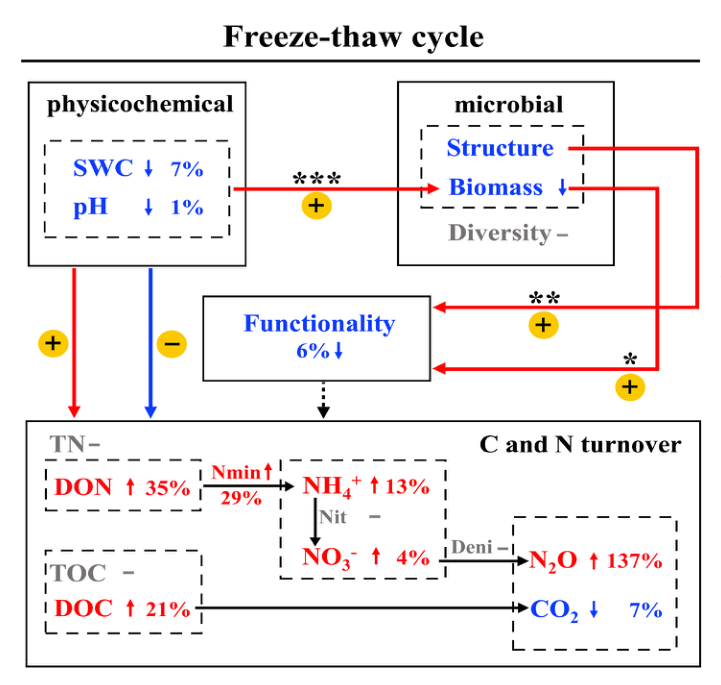 课题组通过Meta分析从全球61项已发表的研究中收集了546个观测数据,以揭示全球范围内冻融对微生物群落其驱动的碳氮动态的潜在影响。分析结果表明:冻融没有引起微生物α多样性的降低,但使土壤微生物量发生了极为显著的降低,微生物群落结构也发生了明显的变化,冻融还导致微生物的碳氮代谢功能降低了6%,pH、含水量的变化是对微生物产生影响的关键因子,最后对微生物群落结构与功能变化的关系进行了系统分析。