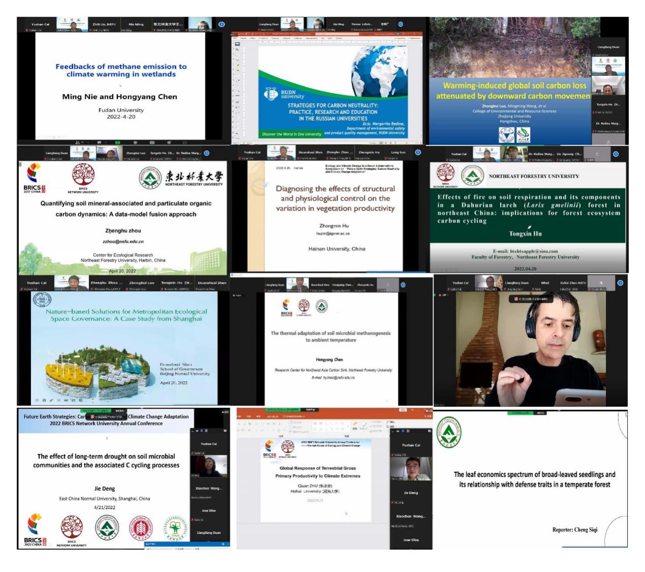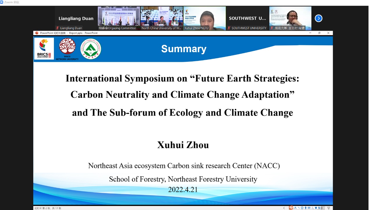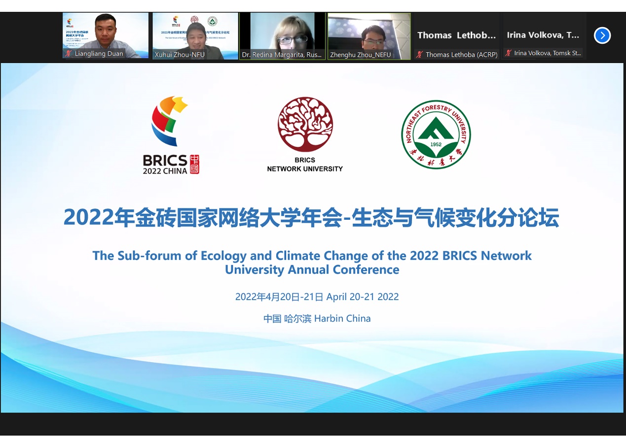 “未来地球对策:碳中和与气候变化应对”国际研讨会暨2022年金砖国家网络大学年会生态和气候变化分论坛于4月20日至21日在线上顺利举行。论坛由我校林学院和国际合作处共同承办,来自俄罗斯人民友谊大学、巴西里约热内卢联邦大学、复旦大学、浙江大学、华东师范大学、北京师范大学、海南大学、河海大学以及我校在内的9所高校的12位专家和学者在大会上做了精彩报告,来自巴西、俄罗斯、印度、中国和南非等金砖国家网络大学成员高校代表100余位专家学者参加了分论坛。
