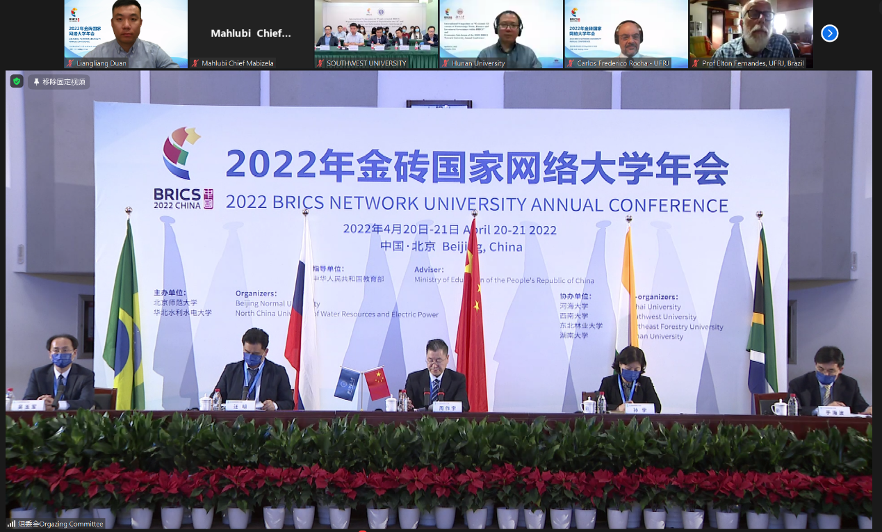 金砖国家网络大学(BRICS Network University)于2015年7月金砖国家领导人第七次峰会上宣布成立,主要在能源、计算机科学和信息安全、金砖国家研究、生态和气候变化、水资源和污染治理、经济学等六个优先合作领域开展交流研讨。中国是2022年金砖国家轮值主席国。4月20日至21日,2022年金砖国家网络大学年会以线上线下相结合的方式在北京召开。本次年会以“构建一流大学间伙伴关系,助力金砖国家可持续发展”为主题,围绕上述六个优先合作领域设置主论坛和平行分论坛,共同探索金砖国家高等教育合作与可持续发展。我校承办了本次年会生态和气候变化分论坛。