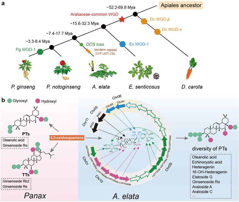 本研究为解析五加科近缘植物间三萜皂苷类化合物积累的特征差异及分子机制,首先采用PacBio三代测序技术及Hi-C技术构建高质量的龙牙楤木基因组图谱,然后通过比较基因组及转基因功能互补分析,首次阐明了龙牙楤木基因组中负责催化玛烷型皂苷的关键酶基因DDS(达玛烯二醇合酶)存在外显子缺失,导致龙牙楤木无法合成达玛烷型皂苷。进一步的分子进化与基因组结构分析表明,楤木属在与人参属植物分化后,其基因组中三萜皂苷修饰酶基因发生了大量的串联重复。而后,结合转录组、代谢组和生理生化试验,鉴定了多个催化龙牙楤木三萜皂苷合成的关键酶,系统解析了齐墩果烷型楤木皂苷的生物合成途径。最后,通过合成生物学手段,利用酿酒酵母做为底盘细胞,从头合成了多达13种不同结构的楤木皂苷。这项研究揭示了五加科植物三萜皂苷类化合物结构多样性形成的进化机制,也为理解串联重复基因在植物次生代谢进化中的作用提供了重要的启示。此外,对龙牙楤木药用成分的“绿色生物制造”也具有重大指导意义。