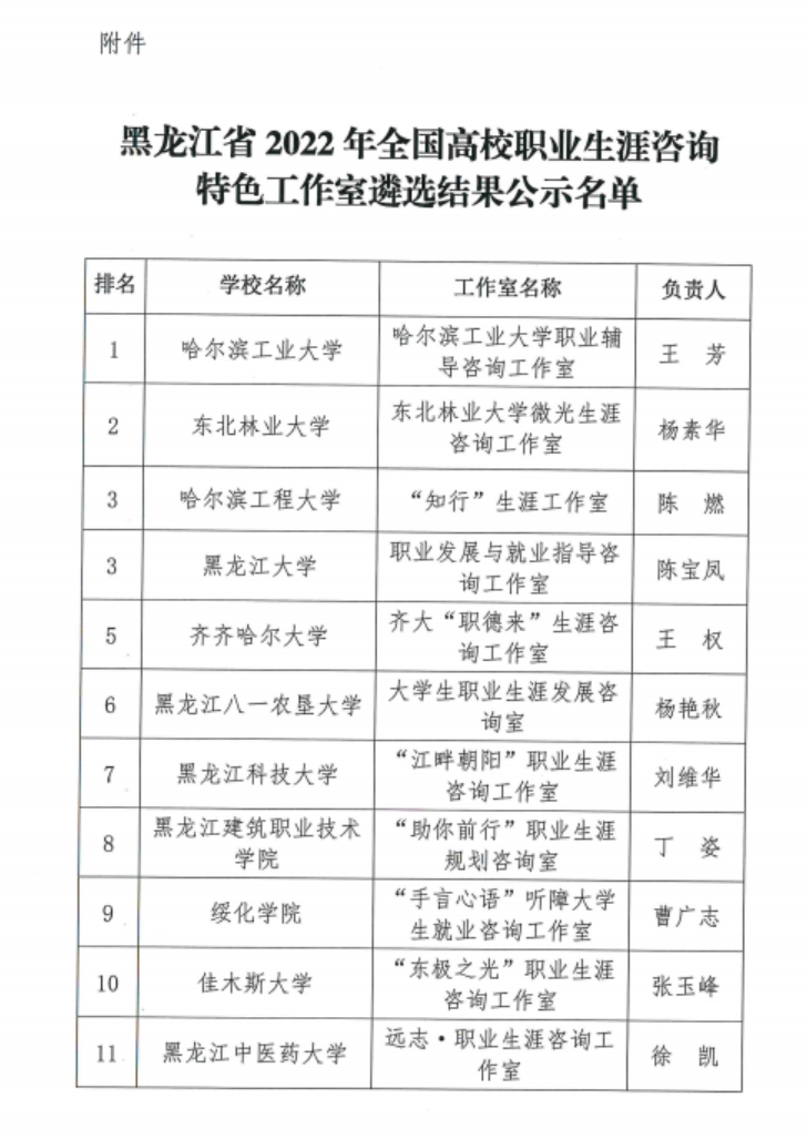 5月17日,黑龙江省大学生就业创业指导中心公布了黑龙江省2022年高校职业生涯咨询特色工作室遴选结果,我校“微光”职业生涯咨询工作室成功入选,并以全省第二名资格推荐至教育部学生服务与素质发展中心,将参加全国高校职业生涯咨询特色工作室评选。