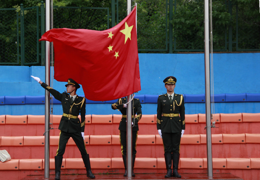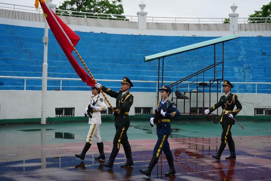 早上7时,仪式正式开始。在师生的注目礼下,国旗护卫队迈着铿锵有力的步伐护送国旗入场。伴随着激昂雄壮的义勇军进行曲,五星红旗冉冉升起。