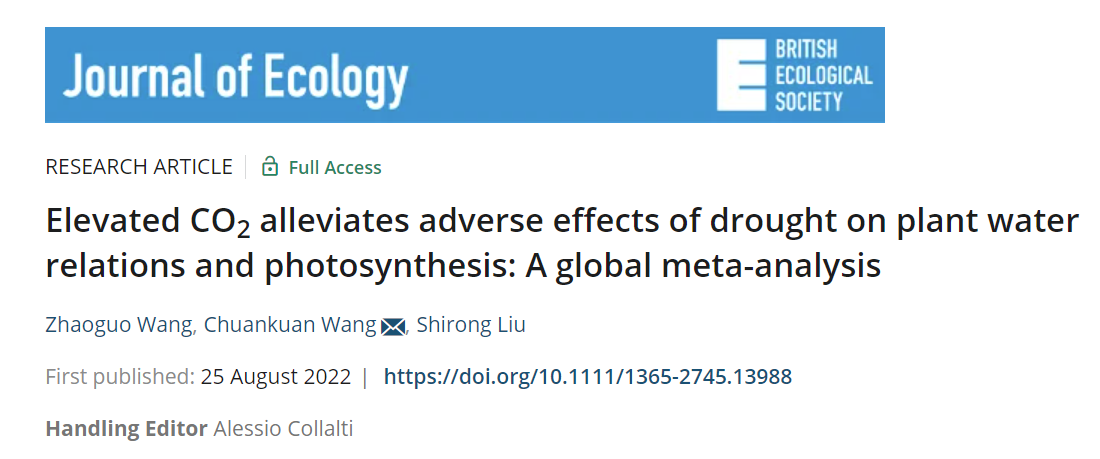 近日,我校林学院生态研究中心王传宽教授团队在全球气候变化与植物生理生态领域的研究取得新进展,成果以题为《CO2浓度升高缓解干旱对植物水分关系和碳同化的不利影响》(Elevated CO2 alleviates adverse effects of drought on plant water relations and photosynthesis: a global meta-analysis)的论文发表在著名生态学期刊《Journal of Ecology》上。