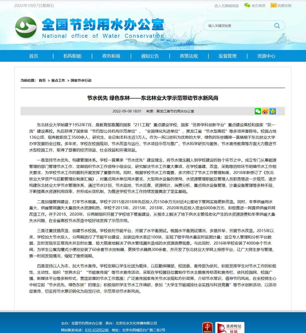 2022年9月,黑龙江省节约用水办公室介绍我校节水新风尚
