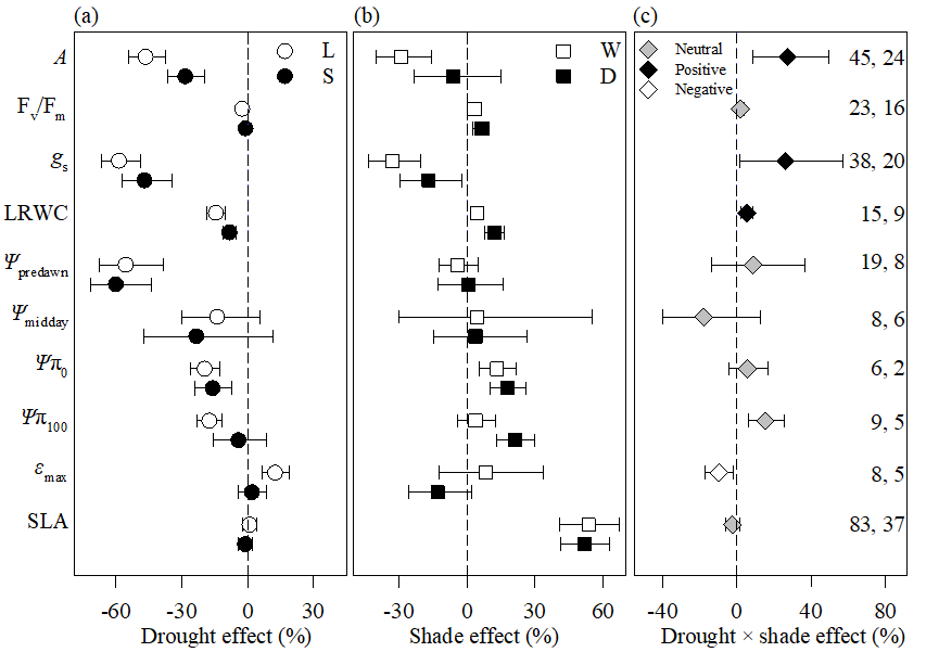 该研究团队通过整合分析了全球58个水分和光照同步控制试验,剖析树木幼苗生物量生产和分配以及叶性状对干旱和庇荫的响应和适应机制。研究结果显示,庇荫通过缓解气孔限制和光抑制,减缓了干旱对树木光合作用的不利影响,从而促进其生物量生产,支持了“促进作用”假说;而光照不足限制幼苗的渗透调节能力,支持了“权衡作用”假说;但是,干旱和庇荫分别独立地影响生物量分配和比叶面积,两者之间不存在交互效应,支持了“独立影响”假说。这些结果表明“权衡作用”、“促进作用”和“独立影响”假说并非相互排斥的,而是取决于植物的不同性状。这些树木幼苗对干旱和庇荫的驯化和适应机制,在模拟预测全球气候变化下树木的更新、生长和分布以及森林碳汇变化等方面具有重要意义。