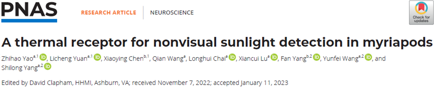 2023年2月13日,美国科学院院刊《Proceedings of the National Academy of Sciences of the United States of America》发表了我校野生动物与自然保护地学院杨仕隆教授研究团队的题为“A thermal receptor for nonvisual sunlight detection in myriapods”的研究论文,该研究发现了一种新型的热敏感离子通道,破译了一种依赖温度敏感受体的间接感光机制。