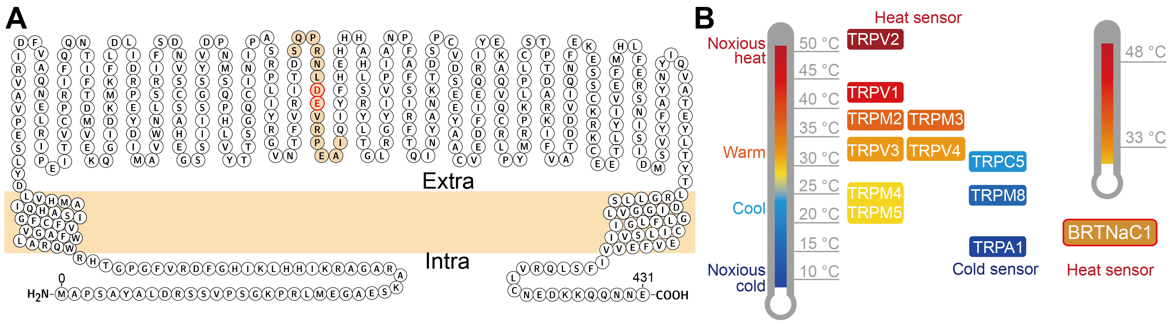 综上所述,该研究识别了一种新型热敏受体BRTNaC1,并对其分子机制和生理学功能进行了探讨:1)BRTNaC1是一种具有较宽温度敏感范围的非选择性阳离子通道;2)BRTNaC1的热激活依赖氢离子对第217和218氨基酸位点的质子化;3)BRTNaC1是多足纲动物感受温度的初级受体;4)BRTNaC1可能参与了多足纲动物的非视觉感光过程。这些结果拓展了我们对ENaC超家族功能的理解,深化了对动物温度感知机理的认识,完善了动物响应非生物信号的理论。