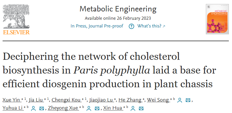 2023年2月26日,我校生命科学学院薛哲勇教授/华欣副教授课题组,在国际合成生物学领域权威刊物《Metabolic Engineering》在线发表了题为“Deciphering the network of cholesterol biosynthesis inParis polyphyllalaid a base for efficient diosgenin production in plant chassis”的研究论文。