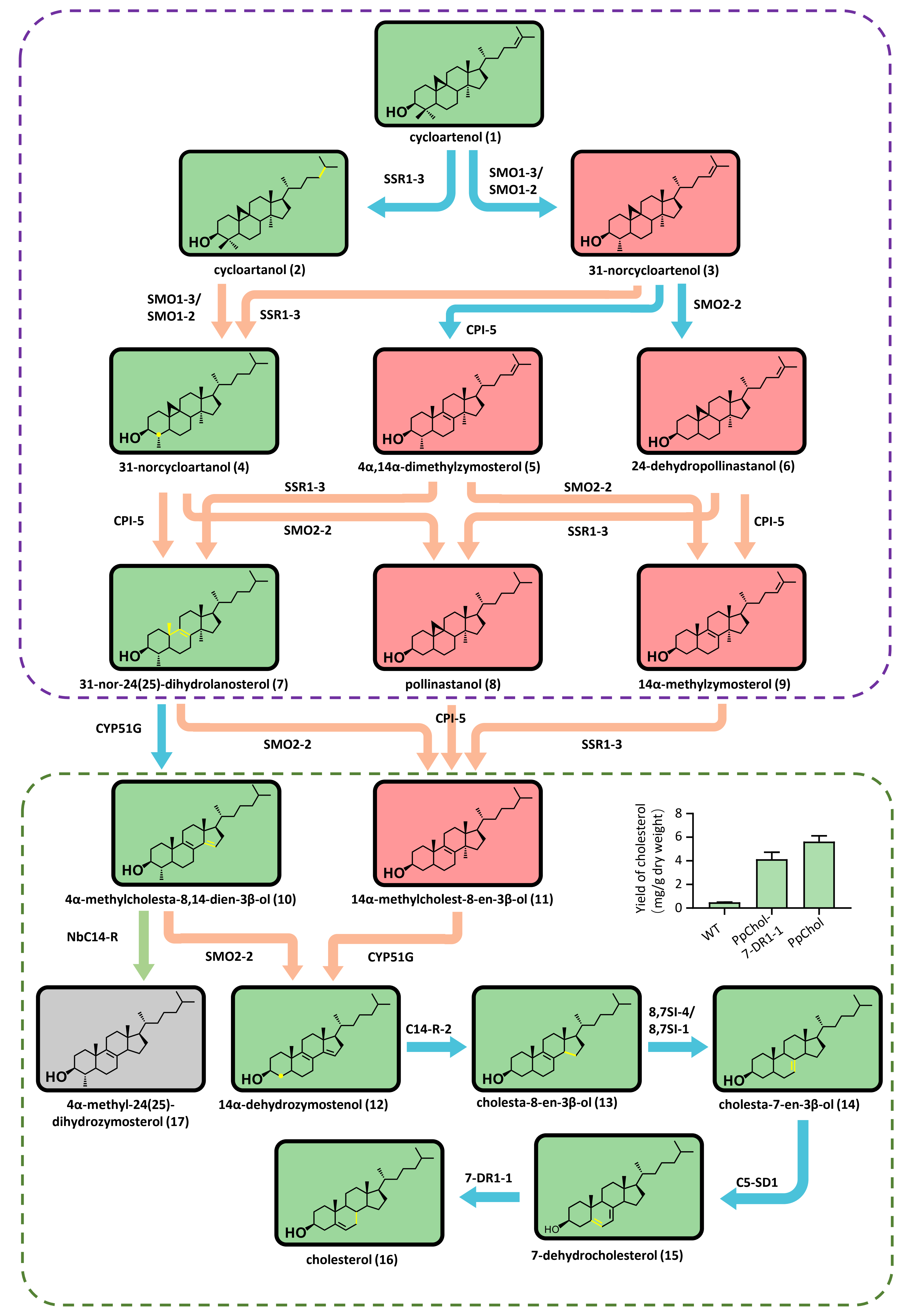 该文章利用根癌农杆菌介导的烟草瞬时表达技术和病毒诱导的基因沉默技术,采用逐步筛选的方法,从药用植物重楼中鉴定出九种酶:SSR1-3、SMO1-3、CPI-5、CYP51G、SMO2-2、C14-R-2、8,7SI-4、C5-SD1和7-DR1-1,成功破译了重楼中从环阿屯醇到胆固醇的详细生物合成代谢网络(图1),并进一步对甲羟戊酸途径的关键基因HMGR进行了优化,将其与PpOSC1基因在烟草叶片中共表达,使环阿屯醇的积累量达到28.79 mg/g干重,为胆固醇生物合成提供了充足的前体(图2)。随后,研究人员采用逐一去除的方式,发现其中六种酶:SSR1-3、SMO1-3、CPI-5、CYP51G、SMO2-2和C5-SD1对烟草中胆固醇的产率至关重要。以此,在烟草中建立了一个高效胆固醇合成系统,产率为5.63 mg/g干重,是野生型烟草产率的11.45倍。利用这一高效的胆固醇合成植物系统,进一步阐明了重楼中的薯蓣皂素形成的生物合成代谢网络,获得了2.12 mg/g干重的产量。这一研究为缺乏体内功能验证系统的药用植物代谢途径的表征提供了有效的策略,也为植物体内合成活性甾体皂苷奠定了基础。