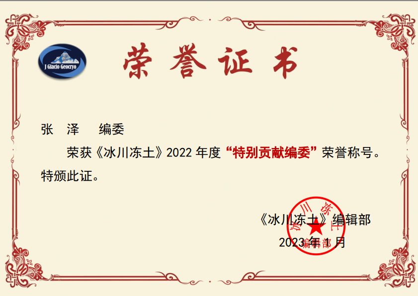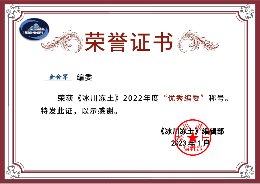 近日,我国冰冻圈研究领域唯一的学报级学术期刊《冰川冻土》发布2022年度“优秀编委”“特别贡献编委”等获奖人员名单,我校土木工程学院冻土科研团队金会军教授被评为“优秀编委”,张泽教授被评为“特别贡献编委”。