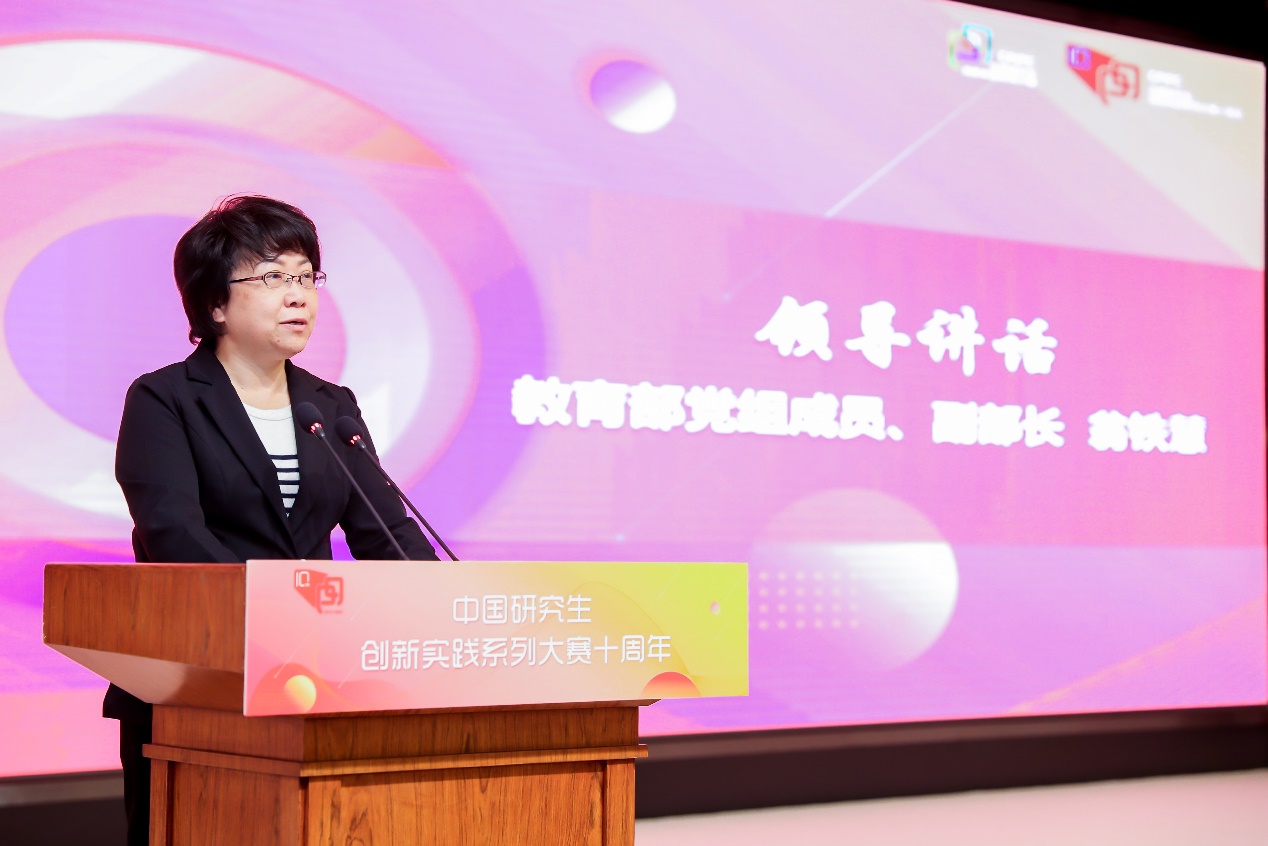仪式上,翁铁慧代表教育部对中国研究生创新实践系列大赛十年来取得的成就表示热烈祝贺,对2023年承办赛事的各单位提出了殷切希望。她指出,中国研究生创新实践系列大赛目前已成为研究生战线备受瞩目的赛事,是提升研究生创新能力和实践能力的重要平台,也是推动研究生教育教学改革的重要抓手。希望各单位以赛促科技创新、以赛促人才培养,助力研究生教育内涵式、高质量发展,登顶世界一流,为中华民族伟大复兴作出更大贡献。