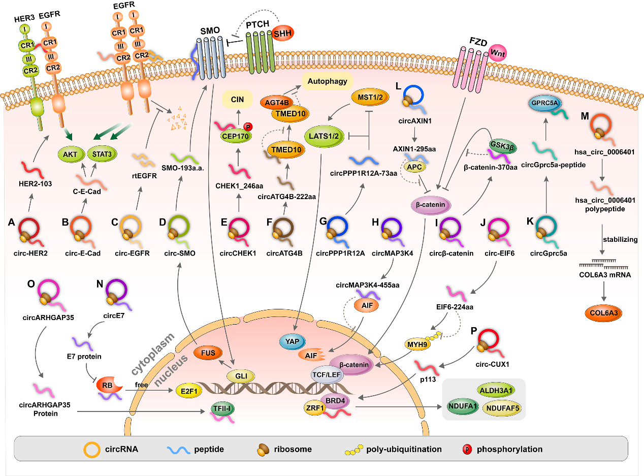 该综述归纳了circ-HER2、circ-E-Cad、circ-EGFR等数十种癌症相关的蛋白编码circRNA,并对其生物发生、同源mRNA产物、调节机制、异常表达、生物学表型和癌症的临床相关性进行了全面的讨论。circRNA编码的多肽既可以作为促癌因子,也可以是肿瘤抑制因子,并可在细胞核、细胞质、细胞膜或以分泌蛋白形式发挥功能。