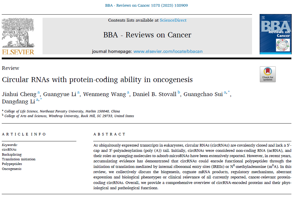 5月10日,我校生命科学学院细胞生物学团队的隋广超教授课题组在国际著名学术期刊《BBA-Reviews on Cancer 》(IF:11.414)在线发表了题为“Circular RNAs with Protein-coding Ability in Oncogenesis”的长篇综述文章。
