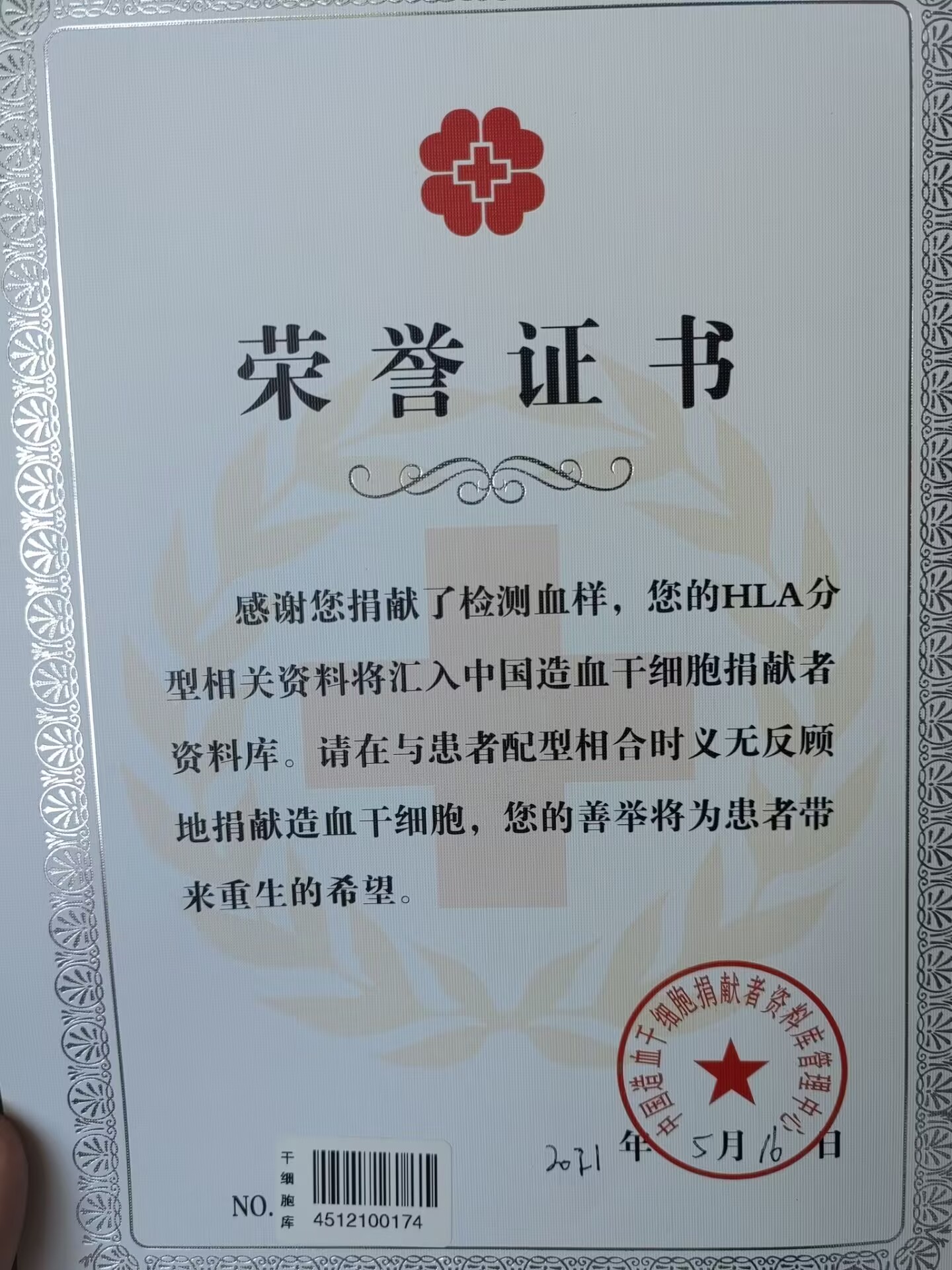 身为当代大学生,刘博文热心公益事业,自2019年入学以来,已累计献血5次。在2021年5月16日的一次献血中,他了解到捐献造血干细胞的相关信息。医生告诉他可以留存一部分血样入库,用于造血干细胞的配型。身为生物技术专业的学生,他对造血干细胞的医疗价值有一定的了解,想到或许自己的小小举动可以挽救他人的生命,他毫不犹豫地签订了相关手续,并当即同意多抽几毫升血样。他的相关信息也就此录入了中国造血干细胞捐献者资料库。