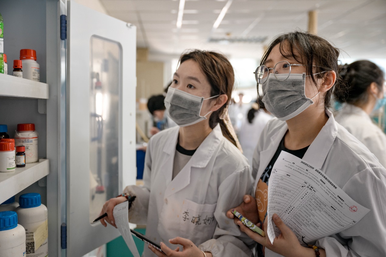 演练环节还设置了“实验室安全隐患识别”。工作人员在实验室设置了50处隐患点,隐患种类包括试剂存放类、实验气体类、危废管理类、实验操作类、加热设备类、制冷设备类、其他安全类等。“这边的试剂摆放不合理,应固体在上、液体在下”“这个气瓶里装的什么呀?缺少信息牌”“这电线是裸露在外面的,不规范”……现场参加演练的学生分组在实验室查找隐患,他们一边细细查找、一边认真记录并拍照留存。他们的查找结果将被作为学习成绩的一部分进行考核。