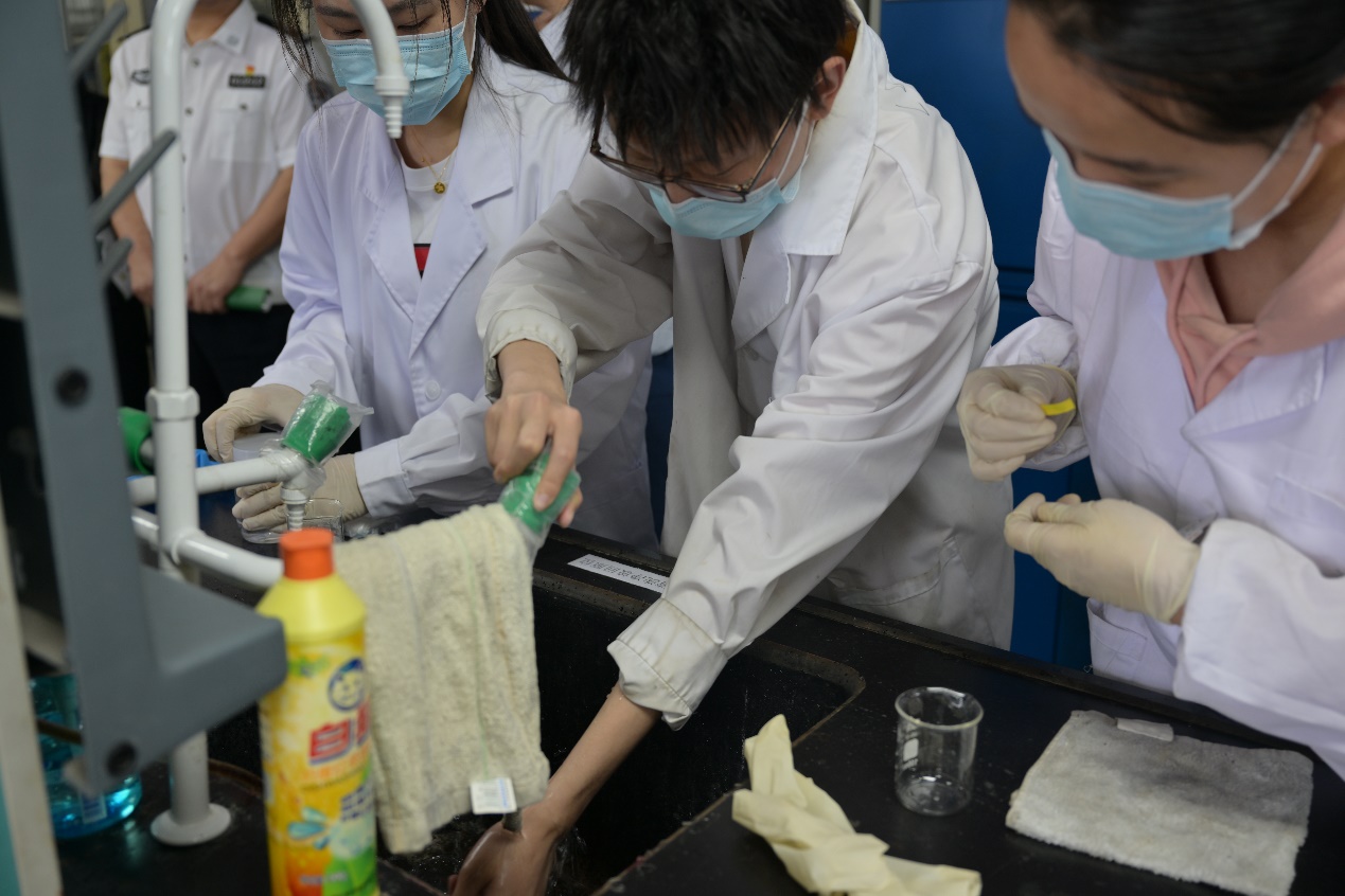 “快点,我的胳膊被灼伤了!”实验室另一边,一位同学在实验过程中,不慎将碱性液体滴洒到了皮肤上,旁边的同学赶紧拿来纱布上前帮忙擦拭。随后,被灼伤的同学用清水冲洗,同时还用PH试纸不断测定创面的酸碱度……
