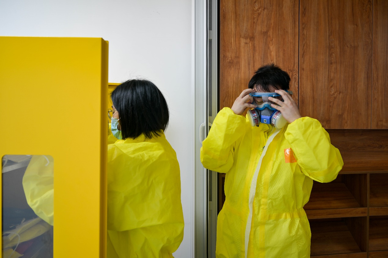 一名同学不小心将盐酸瓶打翻在地,该同学立刻脱下手套和实验服,检查身上是否有盐酸喷溅。旁边两名同学迅速到走廊应急器材柜取出防护套装穿上,其他两位同学取吸附带、消防铁固废收集箱和生石灰。把吸附带围在盐酸泄露处、在打翻的盐酸上面均匀覆盖生石灰、用消防铁锹将固体粉末收集起来放入固废收集箱内……短短几分钟内,小组内同学按照规范步骤完成泄漏液体的收集及无害化处理。