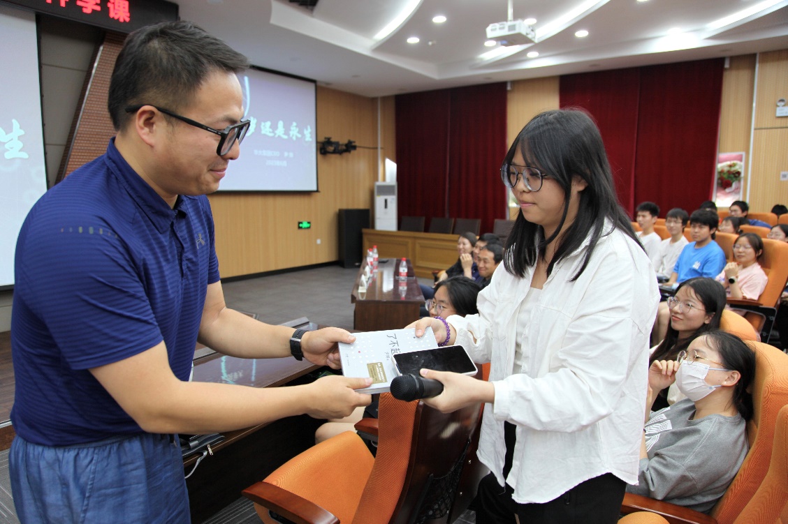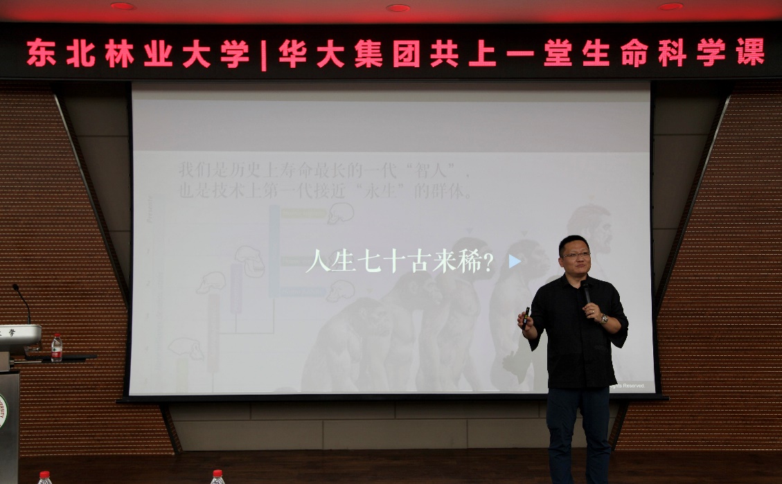 尹烨对我校学子在华大集团的优秀表现和取得的成绩给予高度评价,希望未来有更多的新生力量加入,进一步深入推进双方在教育培养、科学研究等方面的合作。接着他以《百岁还是永生》为题,从生物学角度对生命健康进行了阐述,从哲学层面分享了对生命价值、意义的思考,探讨了人与人、人与社会、人与自然以及人与人工智能之间的关系,同时也对广大青年学生自我提升提出了宝贵的意见和建议。课程还设置了问答互动与赠书环节,现场气氛热烈超燃。