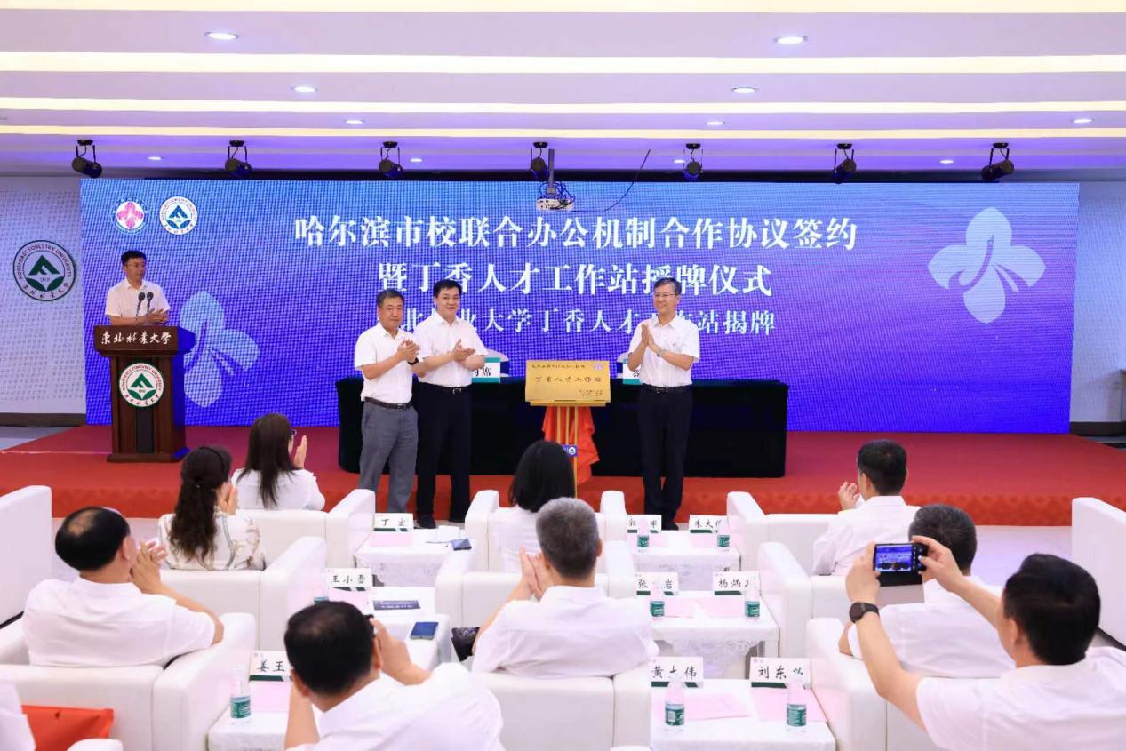 仪式上,16所驻哈高校与9个哈尔滨市属职能部门签署市校联合办公机制合作协议,并为各签约高校丁香人才工作站授牌。我校与哈尔滨市农业农村局成功签约,郭世军、雒文虎、闫常平为东北林业大学丁香人才工作站揭牌。