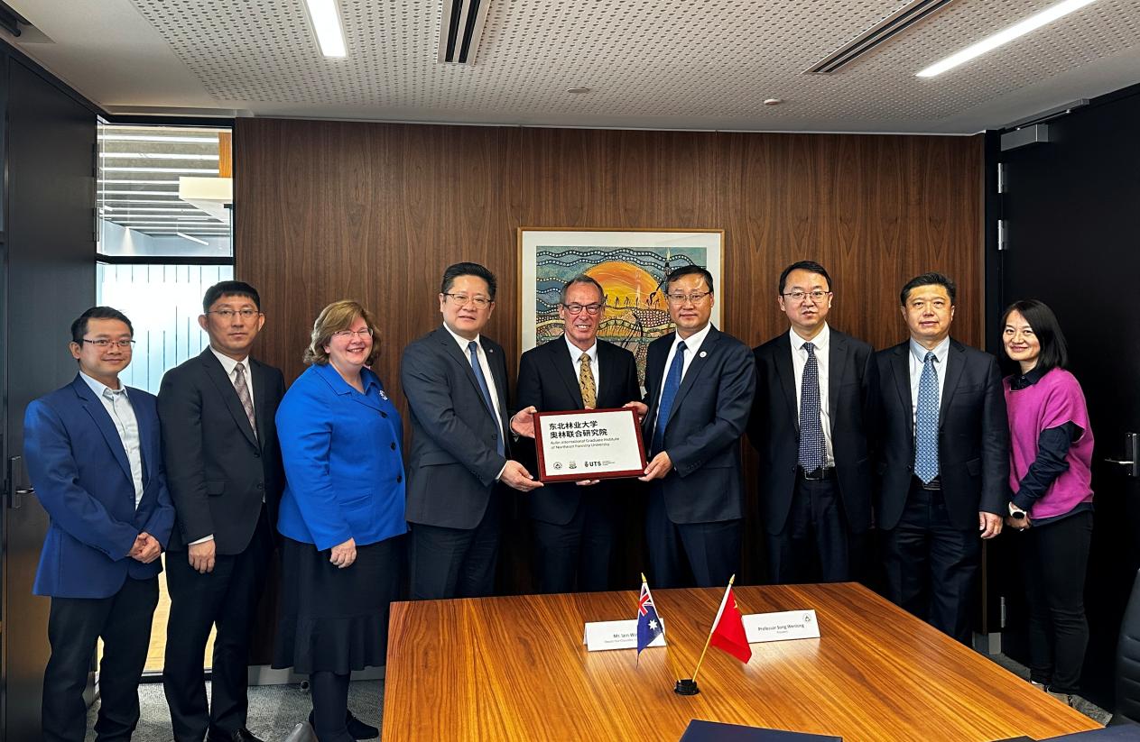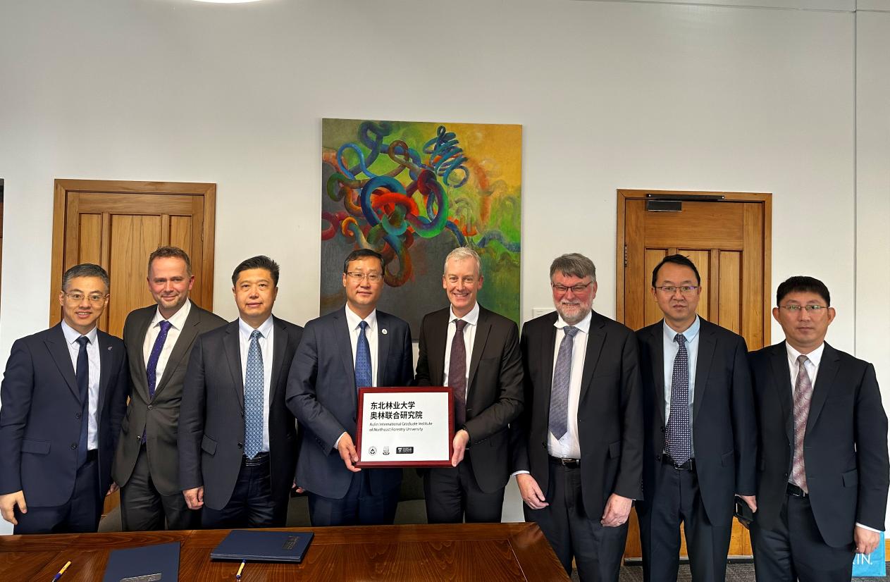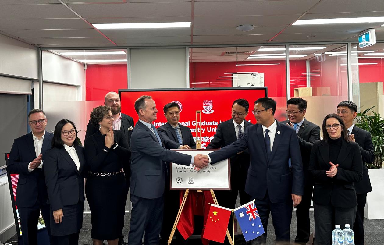 在AEMG Academy,宋文龙一行会见了AEMG Academy学术副校长、澳大利亚科学院院士安德鲁·罗伯茨教授,双方就开展高层次人才联合培养,搭建高水平国际科研平台进行了充分交流。随后,宋文龙出席东北林业大学奥林联合研究院在AEMG Academy揭牌仪式并致辞。