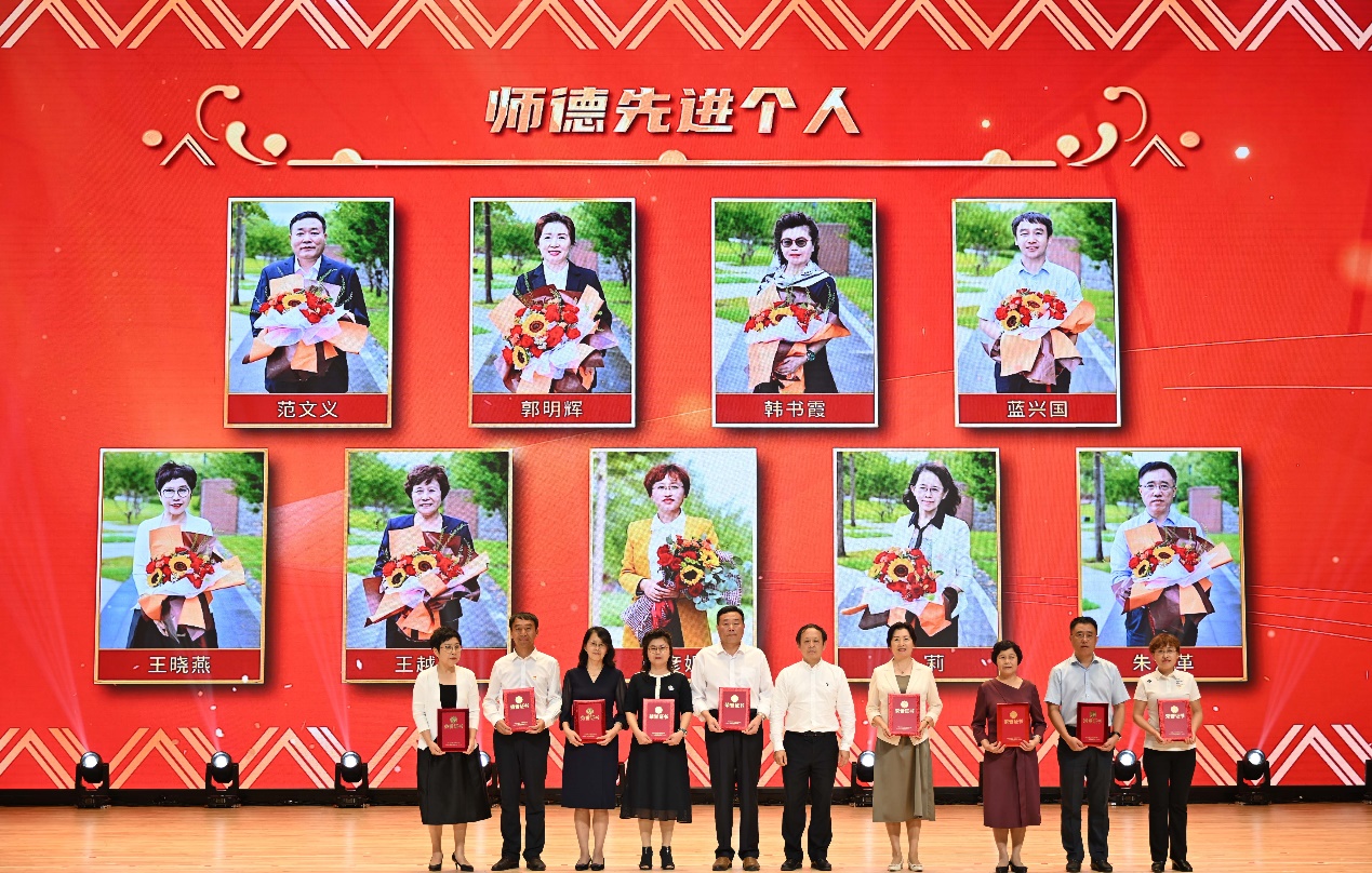 为充分展现新时代学校高质量教师队伍建设的突出成绩和广大教师立德树人、自信自强的精神风貌,激励广大教师和教育工作者积极投身教育强国建设实践,大力营造尊师重教的校园氛围,在第39个教师节到来之际,9月8日下午,学校在科学会堂隆重举行2023年教育工作会议暨庆祝第39个教师节表彰大会。