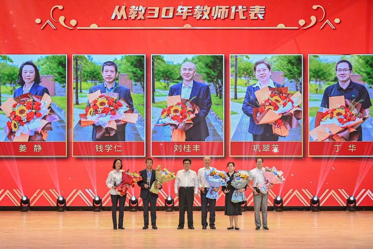 截至2023年7月,我校从教30年教师共33人。他们长期在教学一线默默耕耘,深受广大师生的敬重与爱戴。2023年,我校共有122名新入职教师,他们已经或即将步入教师队伍。活动现场,新入职教师为从教30年老教师代表送上鲜花。