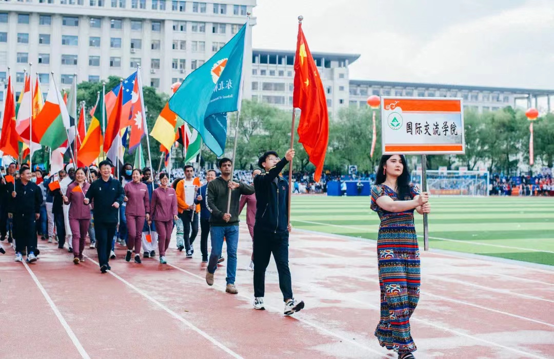 达沙(右一)带领东北林业大学国际交流学院的师生参加学校举办的运动会