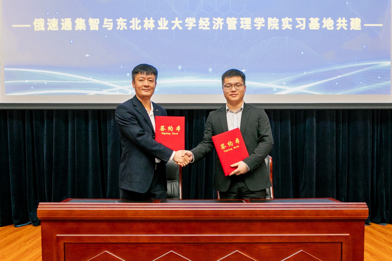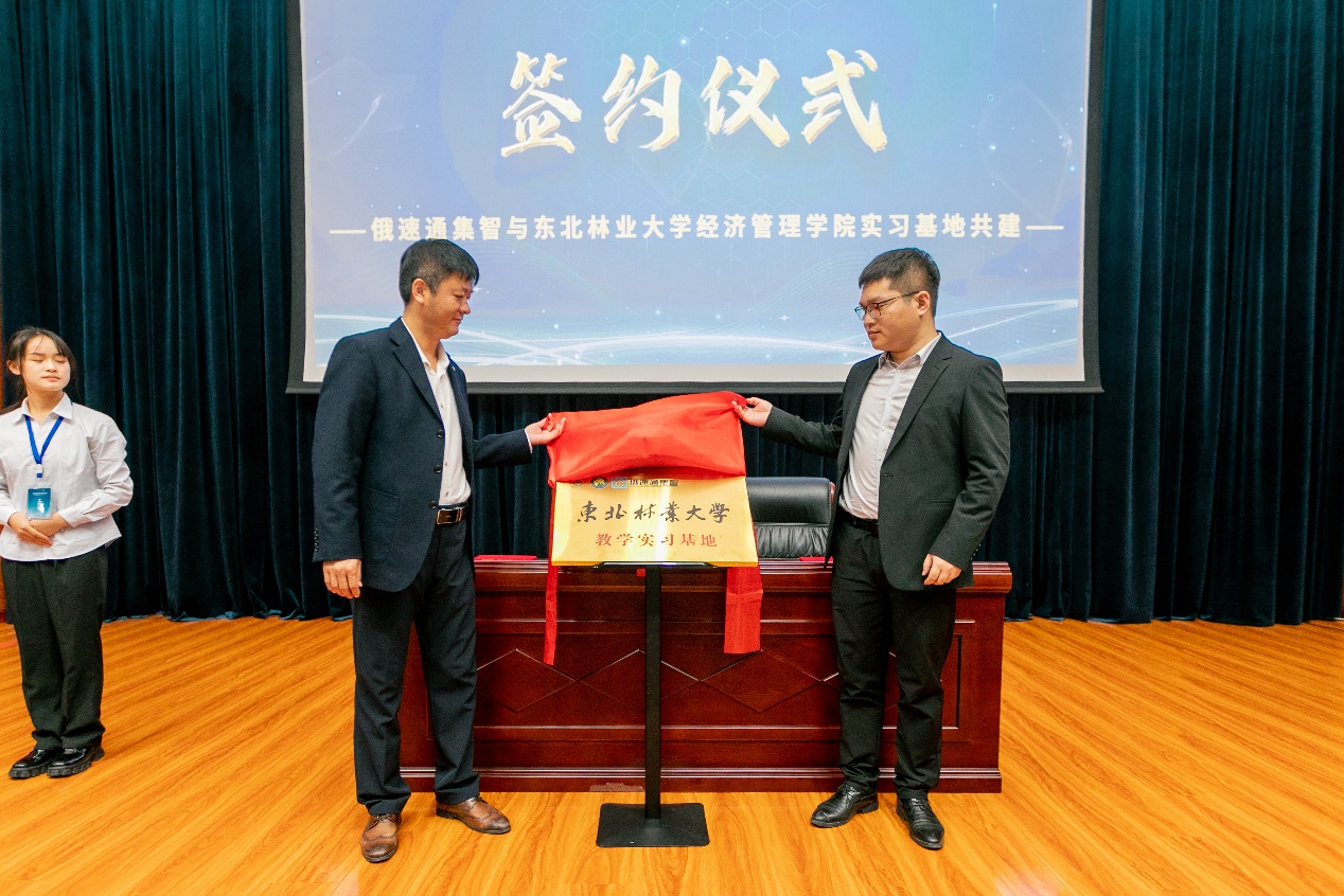 俄速通集智副总经理都宪宇与东北林业大学经济管理学院院长马国勇签署共建实习基地协议,并现场为共建基地揭牌。基地的建立将一步推动校企之间交流合作,促进学生理论能力与实践能力的结合,为学生就业提供更加广阔的平台。