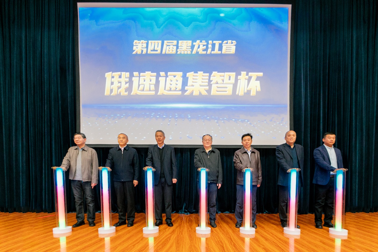 出席会议的嘉宾共同按下启动按钮,第四届黑龙江省“俄速通集智杯”大学生跨境电商创新创业大赛正式启动。