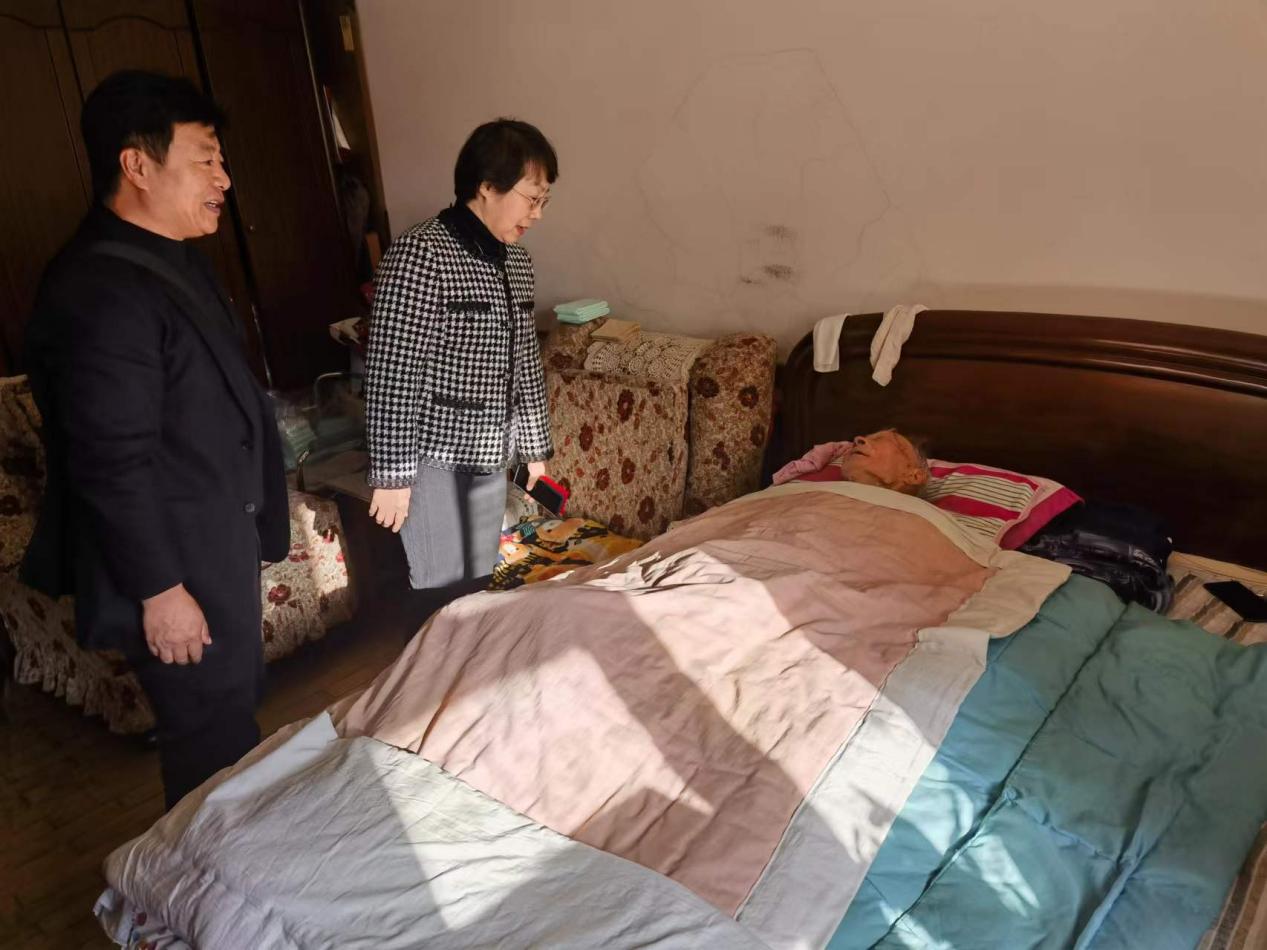 在朱政贤老人家中,陈文慧热情地握住老人的手,与老人亲切交谈,详细询问老人的衣食起居、健康状况和照护情况,叮嘱老人要保重身体,保持心情愉悦,并送上鲜花和慰问金。一声问候,两句细语,洋溢浓浓情意。老人感恩党和国家的好政策,感谢学校的关心和祝福。