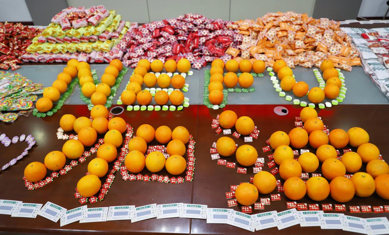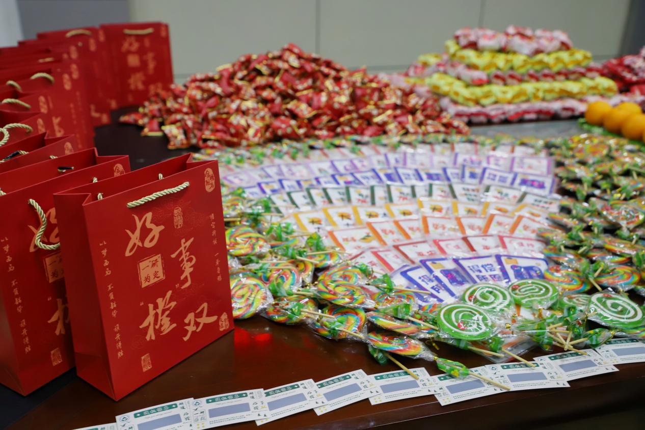 两颗寓意着心想事“橙”、“旗”开得胜的脐橙,蕴含美好祝福的刮刮卡,“薯”你上岸的薯愿薯片,美味可口的好事“花”生,充满甜蜜的棒棒糖和棉花糖,冬日御寒保暖的加油暖贴,让考生好运傍身的状元袜,祝福考生金榜题名、蟾宫折桂的徽章和文具套装……一份份“橙”意满满的礼物都被装在了专门为考研学子设计的“开门红”手提袋中。从最初的准备物资到最终的发放加油包,学生处的老师与学生志愿者们筹备了整整一个多月的时间,将近4000斤的礼物凝聚成1500份沉甸甸的“考研加油包”,只为给考研学子们带来最真切的关怀和最暖心的祝福。